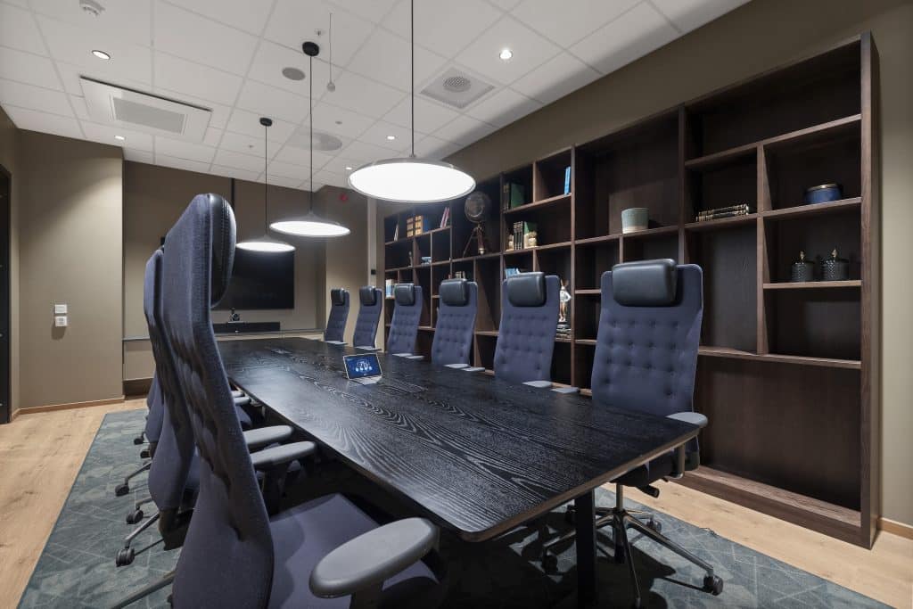 Daisy 2 er et av møterommene i underetasjen. Max kapasitet for 12 personer med fastsatt styrebord.