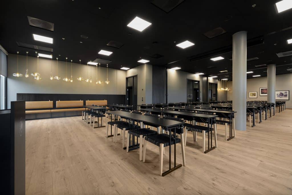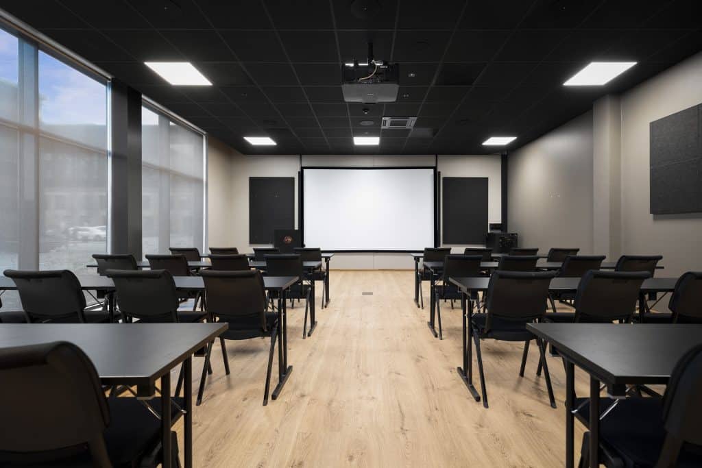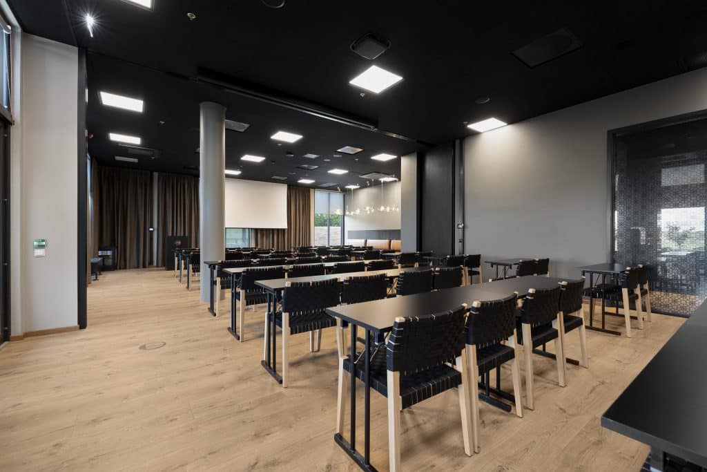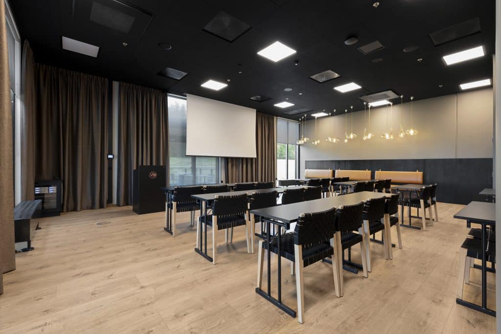 Denne 172 m2 store salen skaper perfekte rammer for faglig og sosialt innhold. Møterommet har en unik utsikt over golfbanen og direkte utgang til vår uteservering i sommerperioden. Max kapasitet på 114 i kino og 120 til middag.