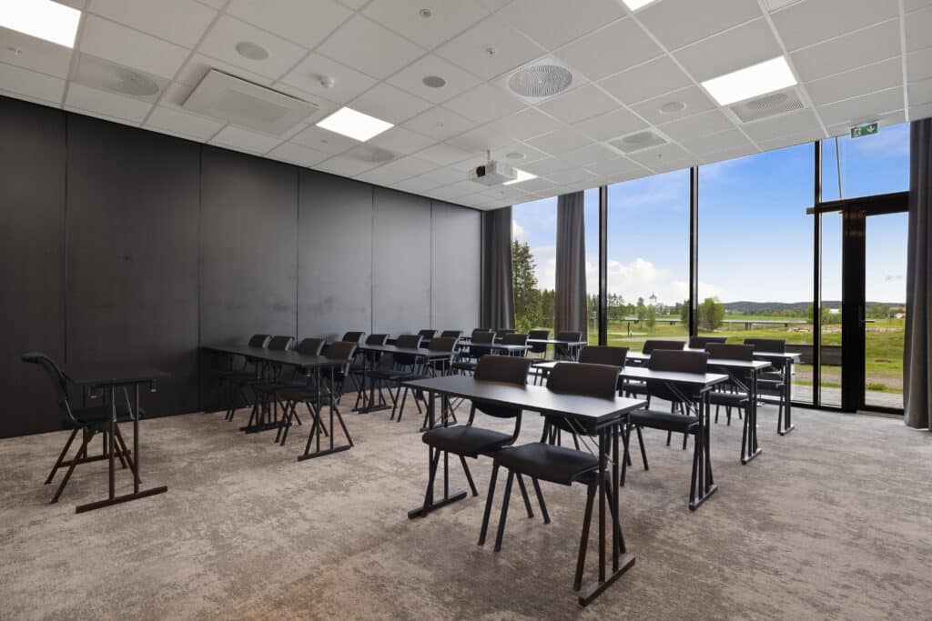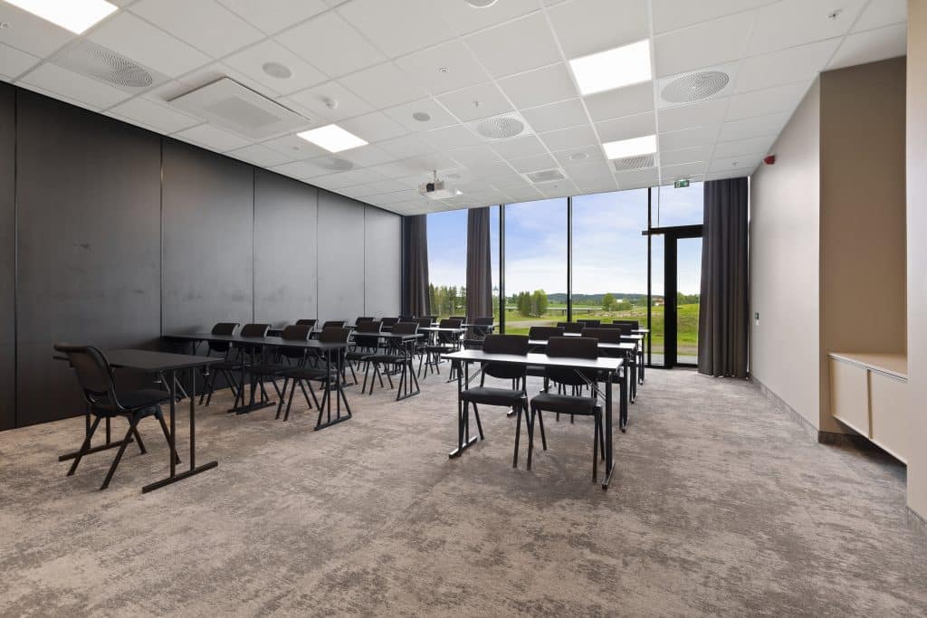 Daisy 3-4 er et av møterommene i underetasjen. Møterommet har vinduer fra gulv til tak med utsikt utover golfbanen samt direkte utgang til markterrasse. Max kapasitet for 96 personer i kino-oppsett.